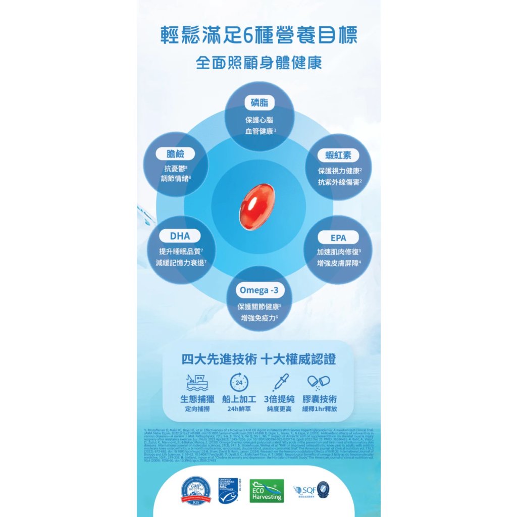 磷蝦來自 MSC 認證南極海域,無污染、可持續捕撈。