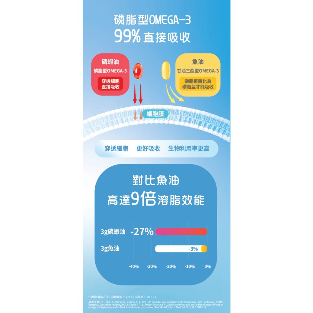 磷蝦油的磷脂型 Omega-3 比魚油更易被人體吸收。
