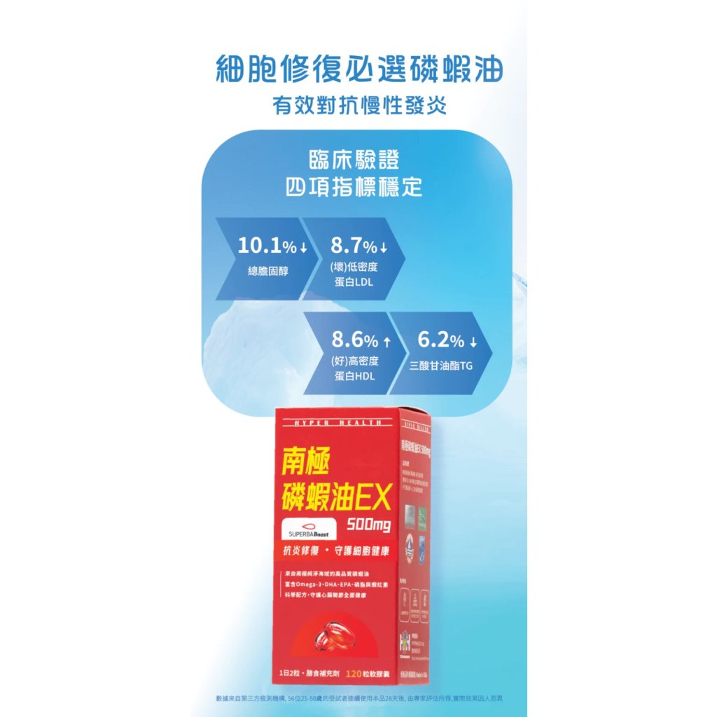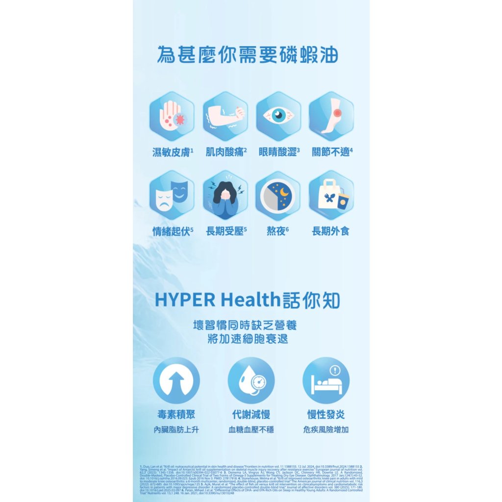 由香港品牌 HYPERHEALTH 研發,美國製造。產品採用來自南極無污染水域的磷蝦,並以環保及可持續方式提取,確保純淨與生態友善。磷蝦油 EX 採用 Superba Boost™ 專利濃縮技術,保留高活性 Omega-3 脂肪酸(EPA、DHA)及蝦青素,提升人體吸收率。